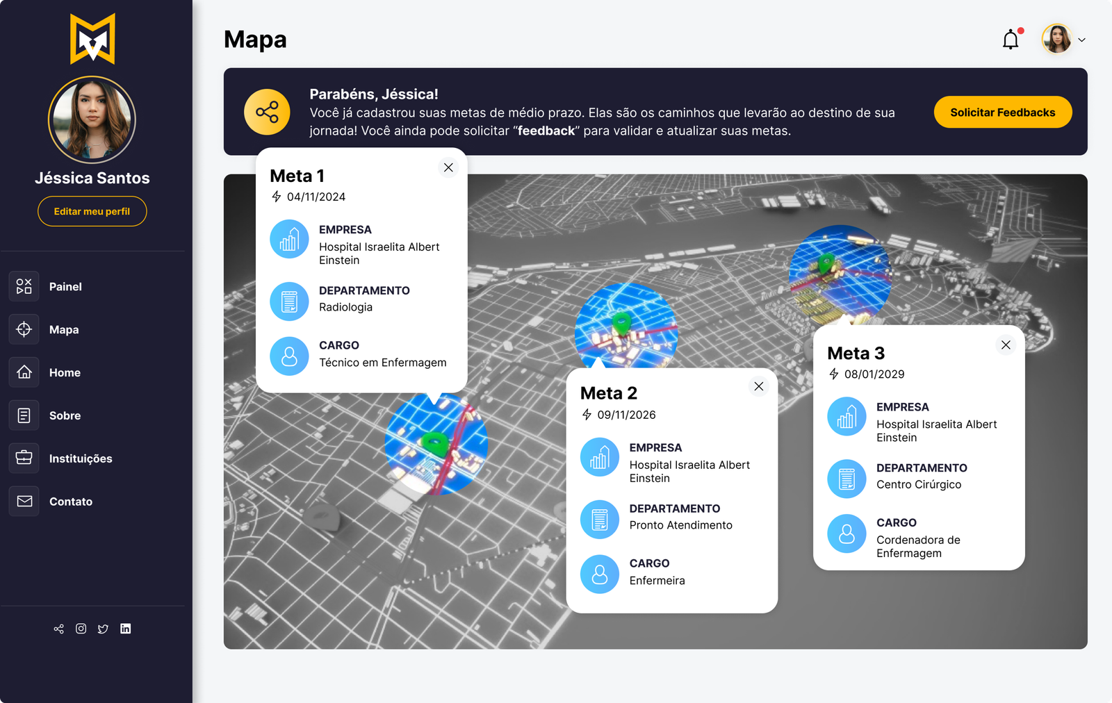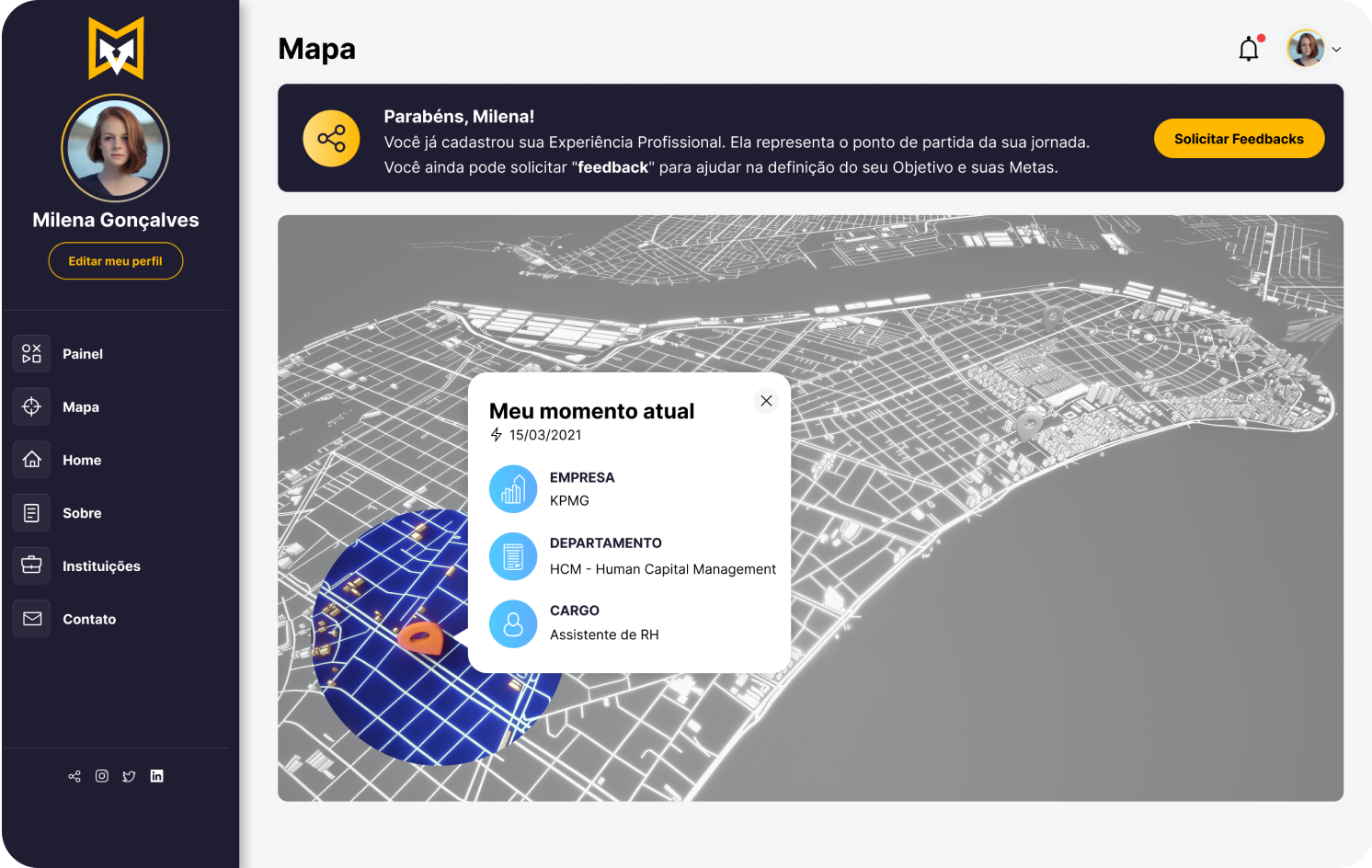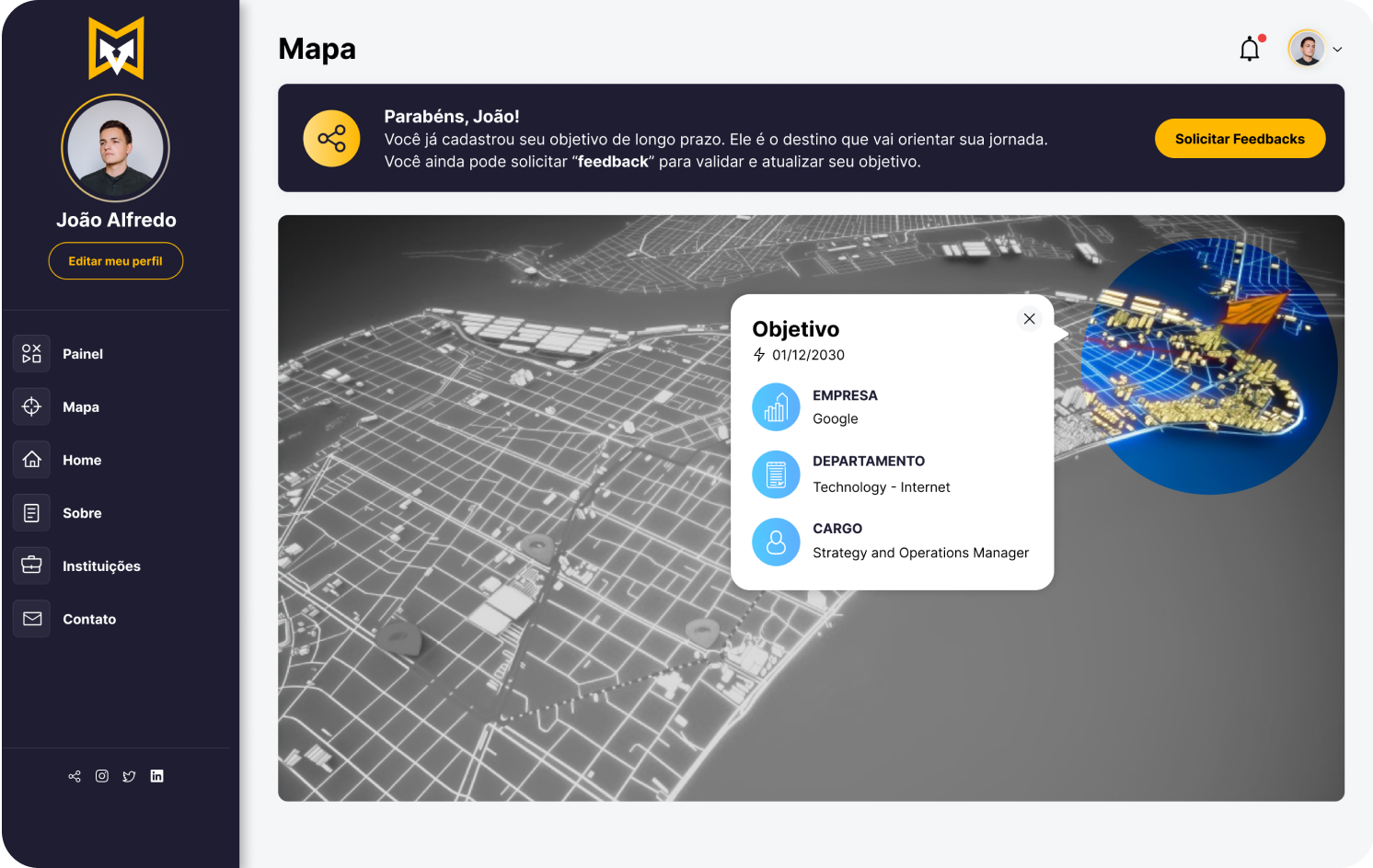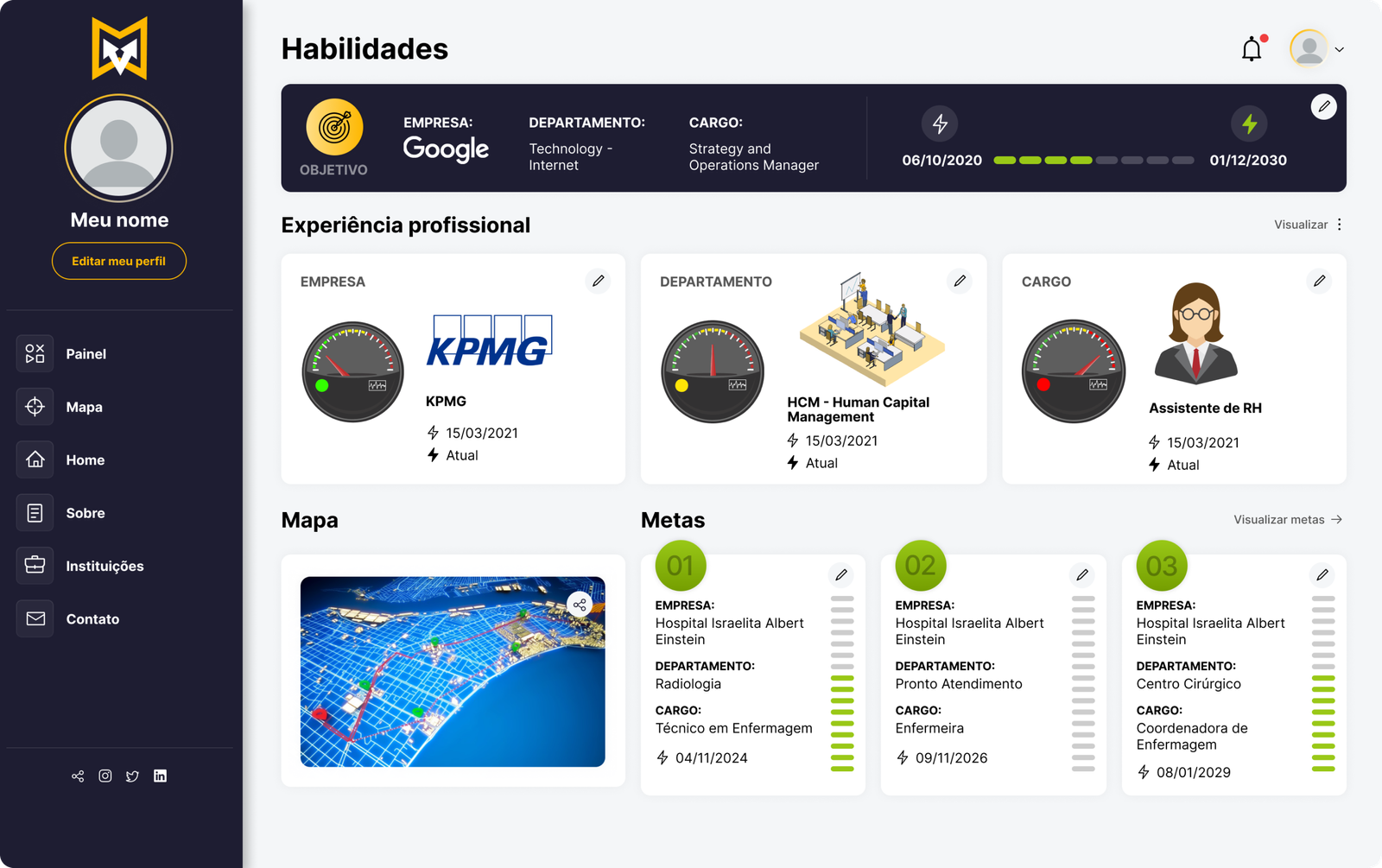 Através do Map você poderá elaborar um mapa dinâmico com os conhecimentos, habilidades e atitudes já adquiridas, mas acima de tudo, permitirá mapear as competências, títulos e certificações que pretende adquirir no futuro, bem como as instituições e organizações onde pretende estudar e trabalhar.